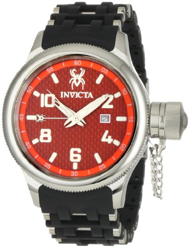 The Invicta Men's Russian Diver Black Rubber Watch offers exciting appeal and modern style to everyday attire. The round polished silver-toned stainless steel case features a coin-edge stainless steel bezel. The red textured dial shows off luminous Arabic numerals at the two, four, six, eight, and ten o'clock hours, along with rectangular, luminous indices at all remaining hours. The twelve o'clock hour is marked with a luminous spider design, and luminous silver-toned hour, minute, and second hands are easy to see against the black dial. The dial also shows off a square date window at the three o'clock hour and a white outside minute track. The black rubber band is accented with silver-toned stainless steel inserts adding to the modern style, and securely fastens by a fold-over clasp with safety. This timepiece offers reliable Swiss quartz movement and is protected by a mineral crystal. The watch is water-resistant to a depth of 330 feet (100 meters).Russian Diver Collection