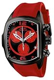 - Black and red dial with red hour markers and arabic numerals at 12:00 and 6:00; red sub-dials; luminous hands; black ion-plated crown and pushers